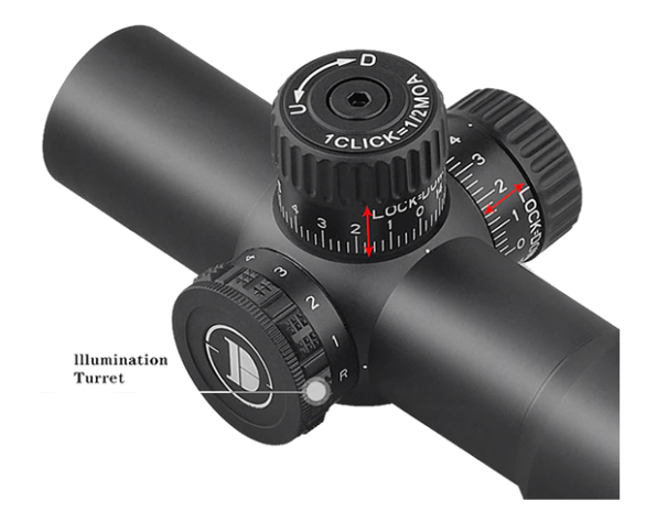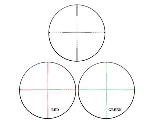 Mira telescópica de 3x24 mm de objetivo. Tubo de 30 mm.Retículo Iluminado Rojo y Verde. Enfoque de Objetivo Regulable. Ajuste Paralaje. Zero Reset. Valor de Ajuste Click 1/2 MOA. Ajuste altura y deriva 50MOA.