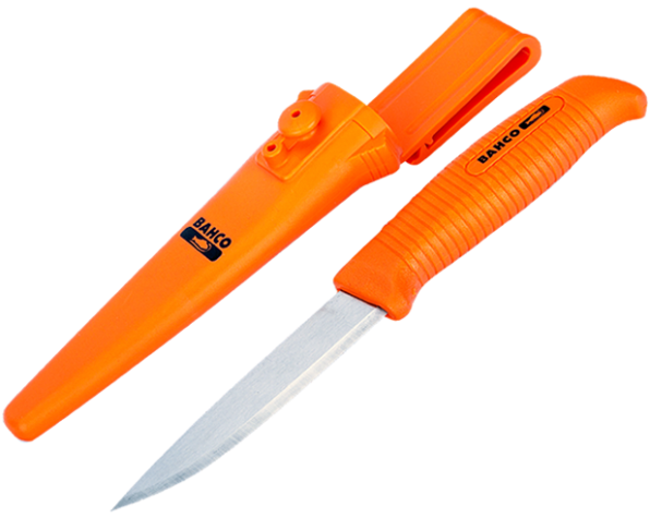 Cuchillo con hoja de acero inoxidable resistente. Mango de un componente que ofrece un agarre cómodo y seguro. Se suministra con una práctica funda especial con doble botón para llevarlos en el cinturón. Hoja de 100 mm de longitud. El cuchillo tiene una longitud total de 220 mm y su peso de 90 gramos.