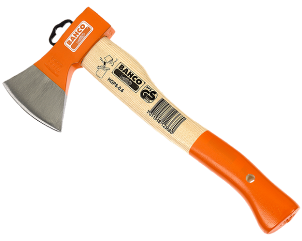 Hacha tipo Alemán. Para uso ocasional en trabajos del hogar, un hacha multiuso para uso general. Hoja fina y ancha que proporciona un corte limpio. Mango de fresno curvado, asegurado con una cuña de fibra de carbono y vidrio. Con un agujero en el mango además del colgador en la cabeza de 8 mm que lleva para poder colgarla de la pared. Peso de 930 gramos.