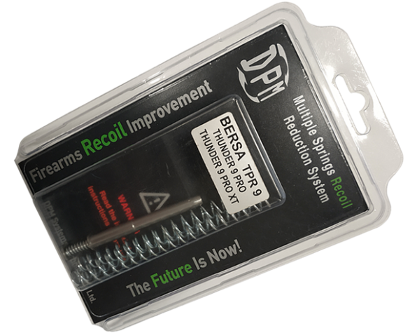 Sistema mecánico de reducción de recuperación para pistolas Bersa modelos TPR9 - Thunder9 Pro - Thunder9 Pro XT. Este sistema funciona debido a la varilla compleja de múltiples muelles (tres muelles) y controla la funcionalidad de la pistola. El tercer resorte que está contenido dentro de la varilla controla el movimiento de la corredera para que nunca se golpee en el marco. Además de este sistema, hay dos resortes separados para que el tirador pueda afinar el arma según sus estándares personales. El resorte más largo (más bobinas) es más fuerte y tiene una clasificación de libras más pesada que el resorte más