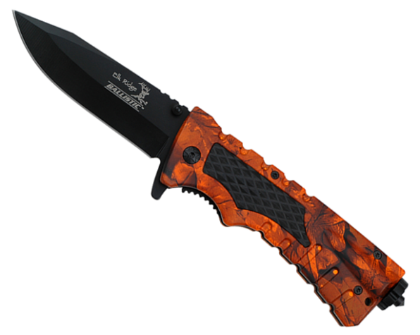 Navaja de apertura asistida por resorte. Largo cerrada 12,70 cm. Hoja de 9 cm acero inoxidable Black. Empuñadura de aluminio Naranja camo con inserto de goma para mejor grip. Incluye rompe cristales desmontable que se convierte en pedernal para iniciar fuego. Práctico clip de bolsillo.