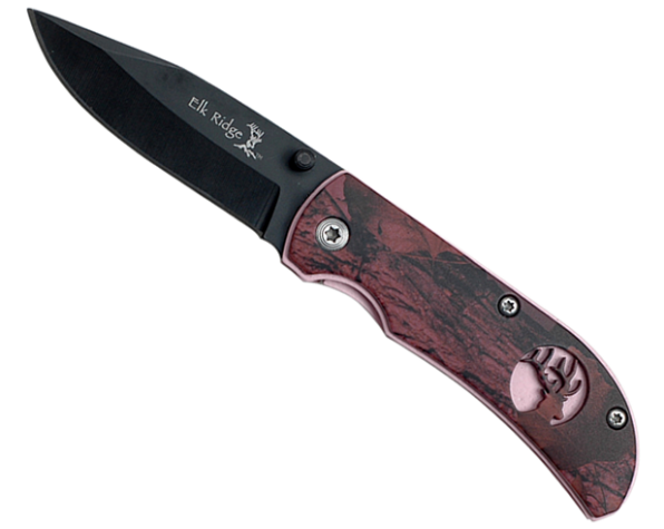 Navaja plegable. Largo cerrada 7,60 cm. Hoja de 6,35 cm de acero inoxidable 440. Empuñadura camo Púrpura logo de Elk Ridge tallado con fondo rosado. Incluye clip de bolsillo.