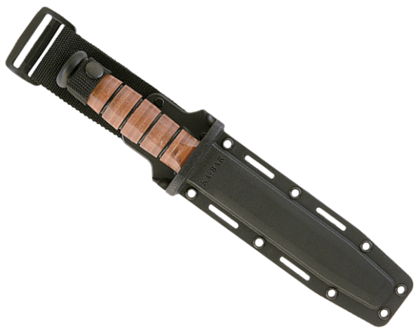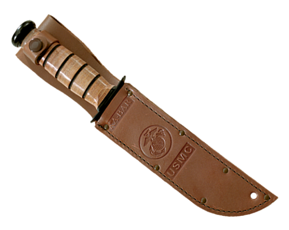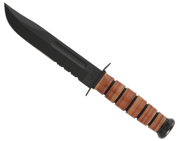 El tradicional cuchillo KA-BAR para el personal del Ejército de USA. Cuchillo de combate / utilitario confeccionado en Acero 1095 Cro-Van (Cromo Vanadio) con un HRC de 56-58. La hoja Clip Point con filo parcialmente serrado posee un largo de 17.78 cm y el lomo un grosor de 4.2 mm. Empuñadura de cuero. Incluye su funda de gran calidad. Made in USA.