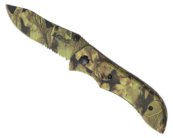 Navaja plegable con terminación camuflada en cachas y hoja. Empuñadura en aluminio. Hoja de Acero Inoxidable 440 parcialmente serrada. Largo de hoja 8,25 cm. Incluye un práctico clip de bolsillo.