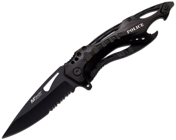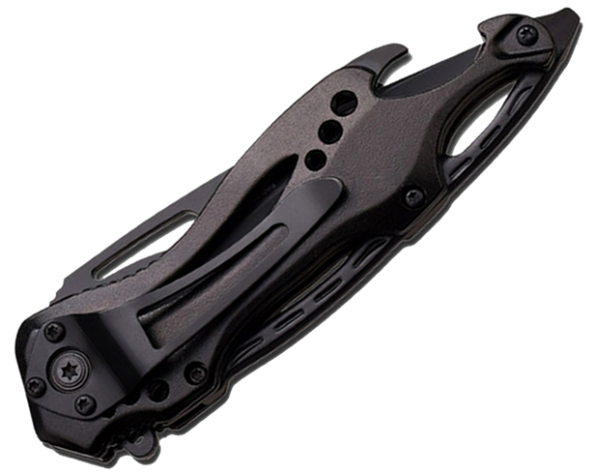 Navaja plegable de apertura manual. Hoja de 8,25 cm y espesor de 3 mm de acero inoxidable, terminación color negro y mitad del filo serrado. Largo de la navaja cerrada de 12 cm. Empuñadura de Aluminio negro. Incluye clip de bolsillo, abrelatas y rompe vidrios.