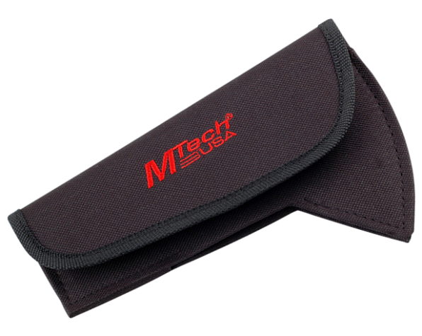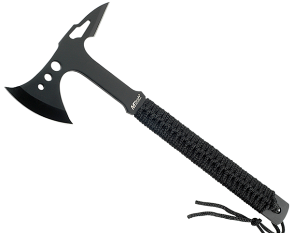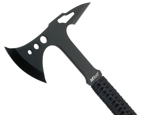 Hacha M-Tech tipo Tomahawk de 38 cm de largo. Hoja y empuñadura de acero 440 inoxidable con excelente terminación en negro. Doblo filo, el principal en forma de medialuna con un largo de 8,90 cm y otro en recto. El mango envuelta en cordón negro para múltiples usos. Incluye funda de nylon.