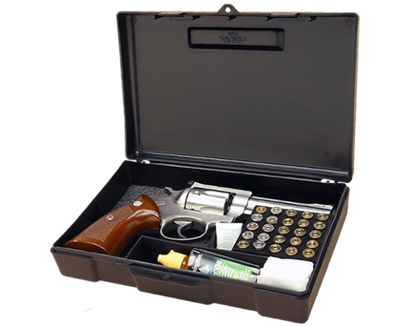 Estuche rígido para armas cortas. Diseñado para guardar el arma por tiempo prolongado. Para armas cortas con cañón hasta 4 pulgadas. En su interior cuenta con goma espuma en la locación del arma. Posee un compartimiento para disecante y un segundo espacio para cargador o artículos de limpieza. También incluye una bandeja de municiones de 25 unidades para 9 mm, .38 / .357, .44 Mag o .45 ACP. El estuche se puede cerrar con candado.