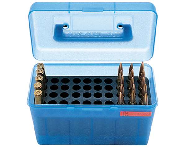 Cajas para municiones con capacidad para 50 unidades y manija de transporte. Las municiones son guardadas en una bandeja especial diseñada para evitar que la puntas golpeen el fondo de la caja evitando todo tipo de daño.