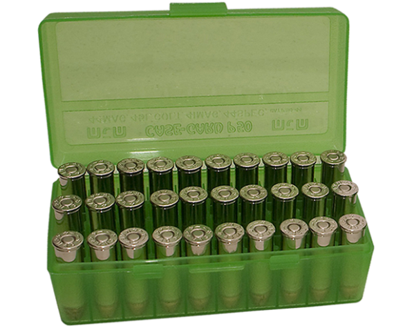 Cajas para municiones con capacidad para 50 unidades. Posee tapa Flip-Top con traba de seguridad. Perfecta para el polígono o guardar municiones recargadas. Con superficie rugosa para mejor grip, también se pueden apilar. incluye etiqueta para identificar las municiones.