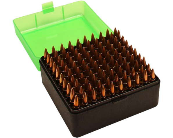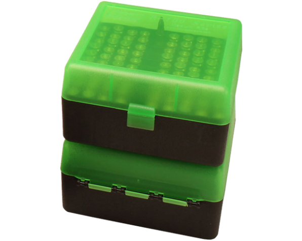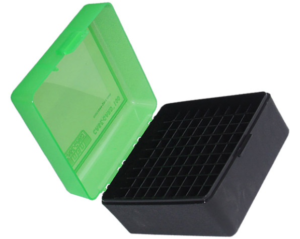 Cajas para municiones con capacidad para 100 unidades. Posee tapa Flip-Top con traba de seguridad. Perfecta para el polígono o guardar municiones recargadas. Con superficie rugosa para mejor grip, también se pueden apilar. incluye etiqueta para identificar las municiones.