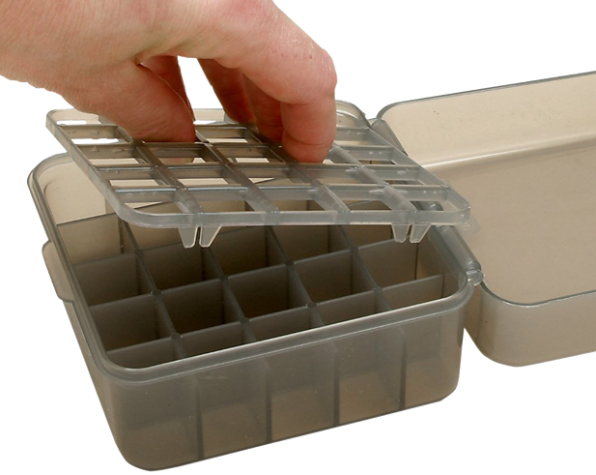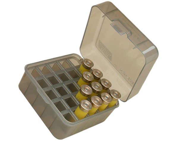 Caja para cartuchos dual, capacidad de 25 cartuchos apuntando hacía abajo. Posee una bandeja removible para el calibre 20. Sin la bandeja se puede guardar cartuchos hasta 3? en calibre 12 y 16. La tapa es de fácil apertura.
