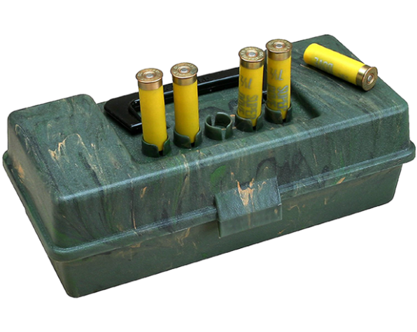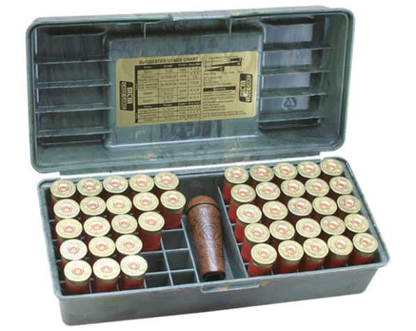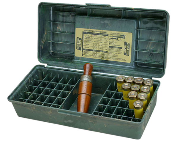 Caja para cartuchos con capacidad para 50 cartuchos y un espacio extra para llamador de patos o chokes de escopeta. La tapa posee 5 posa cartuchos para un rápido acceso al recargar. La caja posee un pestillo de cierre, manija rebatible y terminación texturada en colores Camo.