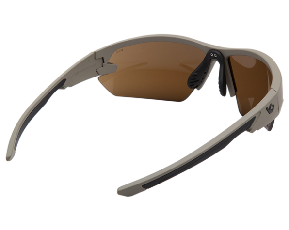 Con un estilo moderno y con máxima protrección. Frame de Nylon muy resistente color arena, puente nasal de TPR, muy suave goma y patillas de policarbonato flexibles inyectadas con goma antideslizante. Lentes de policarbonato color Sandstone Bronze ideal aplicaciones outdoor, ofrecen mayor contraste en situaciones de baja luz. El lente posee protección contra rayaduras y anti-empaño. Proporcionan una protección del 99% contra los dañinos rayos UVA/B/C. Standard de Impacto Militar: MIL-PRF 32432 High Velocity. Incluye funda de microfibra para limpieza y transporte.