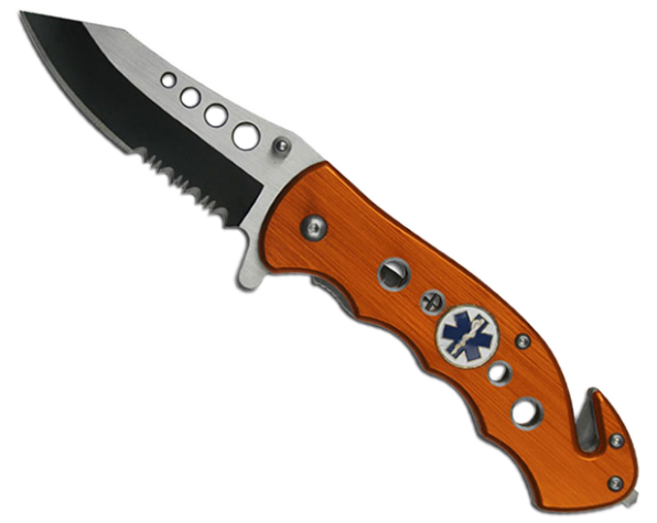 Navaja plegable de apertura asistida. Largo cerrada 12 cm. Hoja en dos tonos de 7,6 cm parcialmente serrada de acero inoxidable. Empuñadura con terminación naranja metálico y medallón incrustado con el logo de Ambulancia. Incluye clip de bolsillo, rompe cristal y corta cinturón.