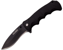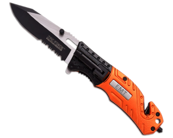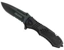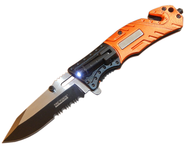Navaja de apertura asistida. Hoja de 8,5 cm en dos tonos Negro y Gris. Acero inoxidable 440 parcialmente serrada. Empuñadura aluminio que cuenta con linterna LED plegable. Incluye rompe cristal y corta cinturón.