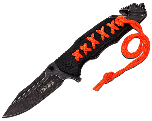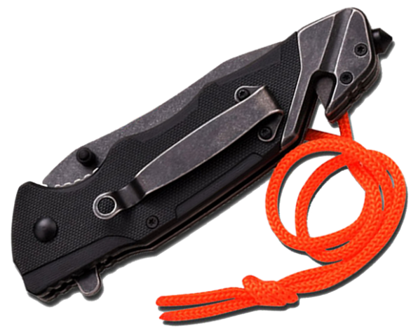 Navaja plegable de apertura asistida por resorte. Hoja de acero inoxidable con un largo de 8,25 cm y espesor de 3 mm. Terminación de la hoja Stonewashed. Largo total de la navaja cerrada 13 cm. Empuñadura de acero inoxidable con cachas negras de G10 y cuerda naranja. Incluye clip de bolsillo, corta cinturón y rompe vidrios.