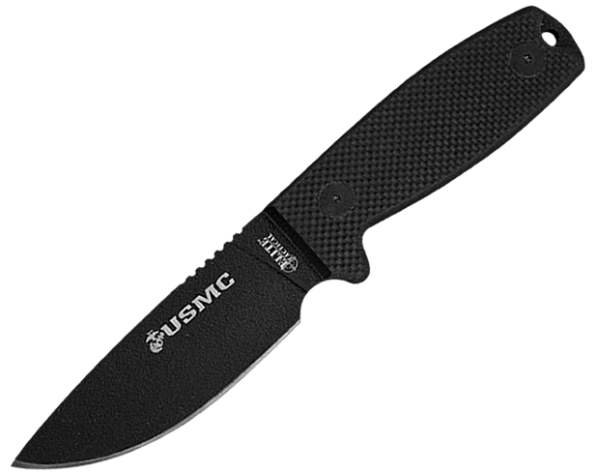 Cuchillo US Marines modelo O-Dark Thirty, de hoja enteriza. Largo total de 20 cm. Hoja en Acero Inoxidable 440C de 9,50 cm de largo y espesor de 5 mm. Recubrimiento negro sobre la hoja. Empuñadura en G-10 color negro. Incluye funda de Nylon 1680D compatible con sistema MOLLE. Licencia o"cial de U.S. Marines.